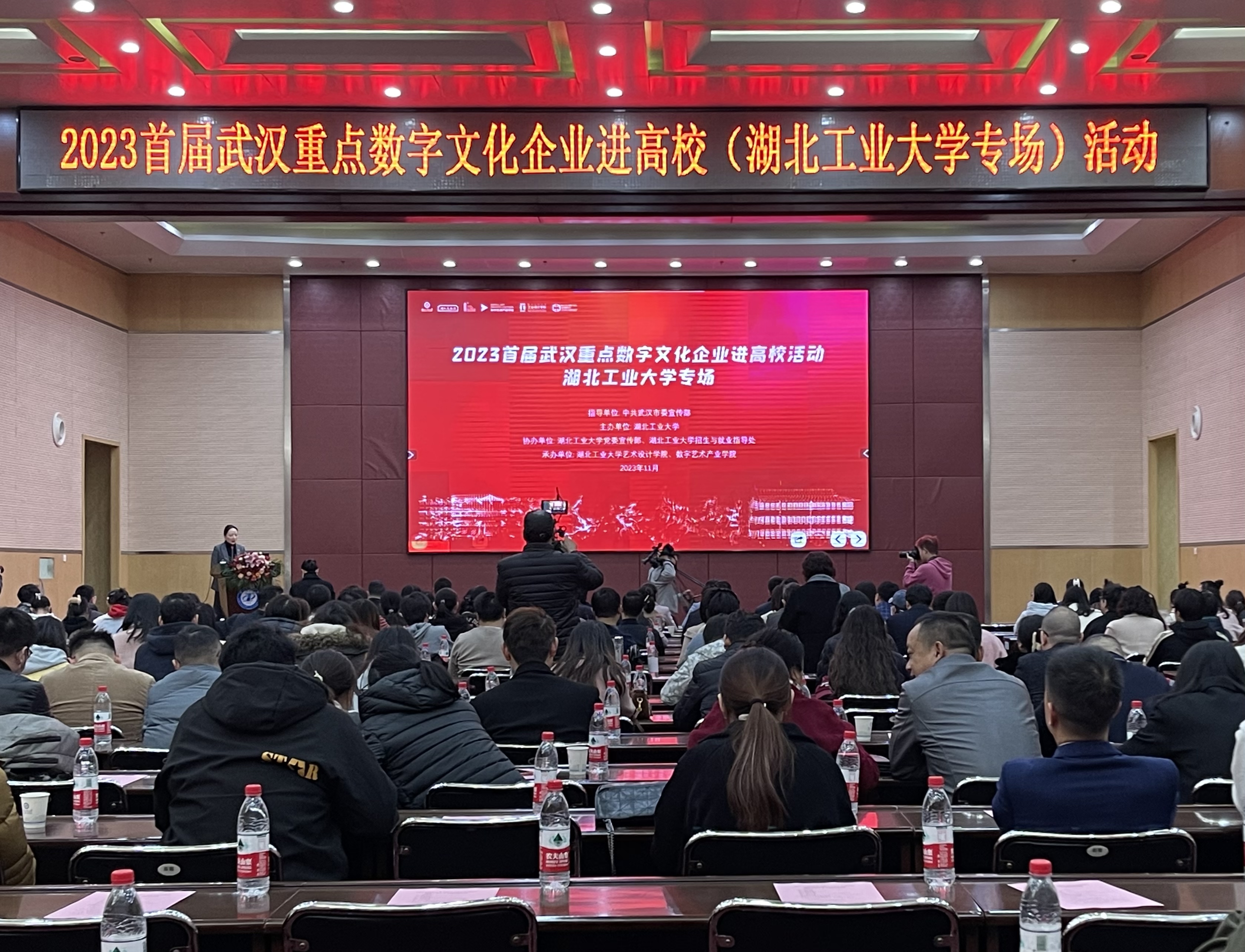 本次活动由中共武汉市委宣传部指导,湖北工业大学主办,湖北工业大学党委宣传部、湖北工业大学招生与就业指导处协办,湖北工业大学艺术设计学院、数字艺术产业学院承办。来自多所在汉高校的300余名师生代表、全市130多家数字文化企业和武汉文化创意产业协会、武汉动漫协会、武汉数字创意与游戏产业协会、武汉市互联网直播协会、武汉市工业设计行业协会、武汉市广告协会、武汉市出版发行业协会、武汉市软件行业协会、武汉市高新技术产业协会、武汉市沉浸式文化产业协会等文化产业领域行业协会相关负责人参加活动。